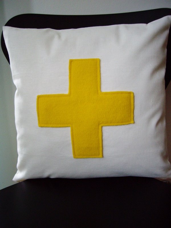 Dekoracyjna prosta minimalistyczna poduszka z żółtym plusem będzie świetną ozdobą każdej kanapy.