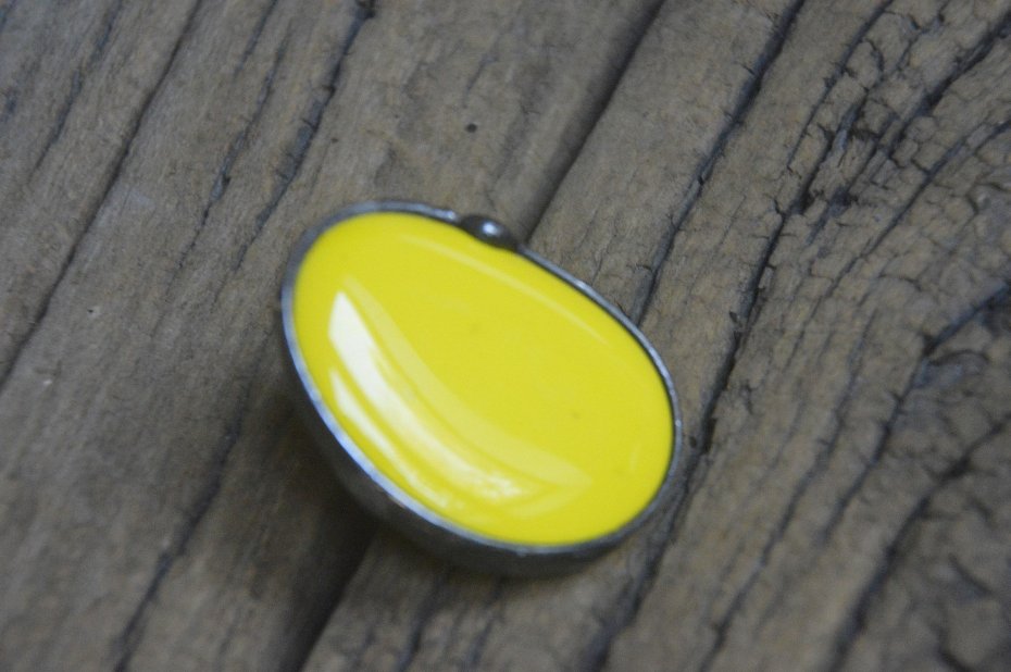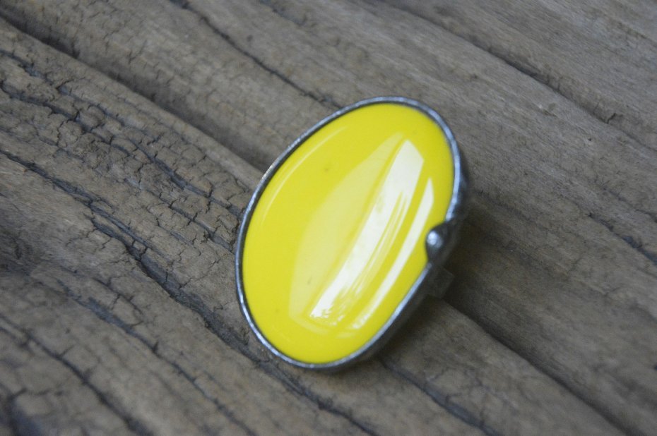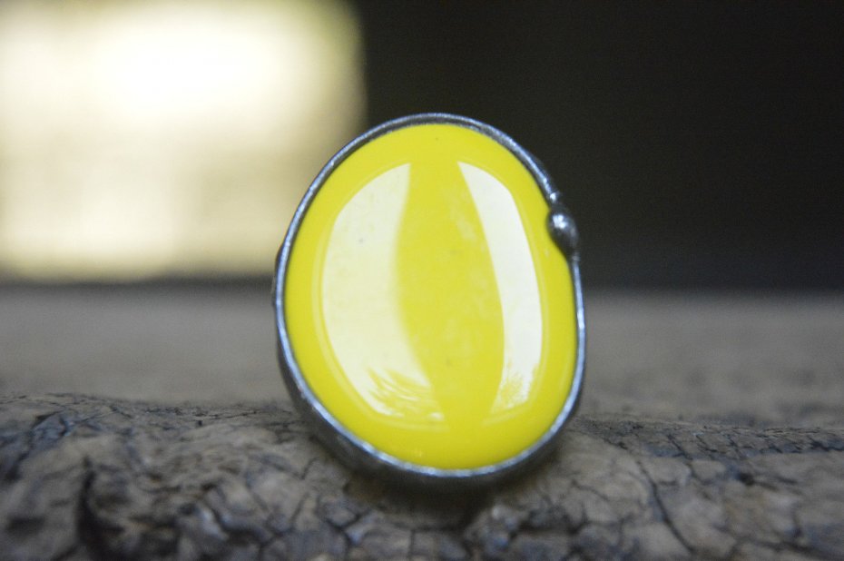 Duży artystyczny pierścionek wykonany z żółtego szklanego kaboszonu oprawionego stopem cyny i srebra na miedzianej bazie. Średnica pierścionka to ok. 4,2 cm , całość stylizowana na stare srebro i ręcznie polerowana. Pierścionek posiada regulowaną obrączkę.