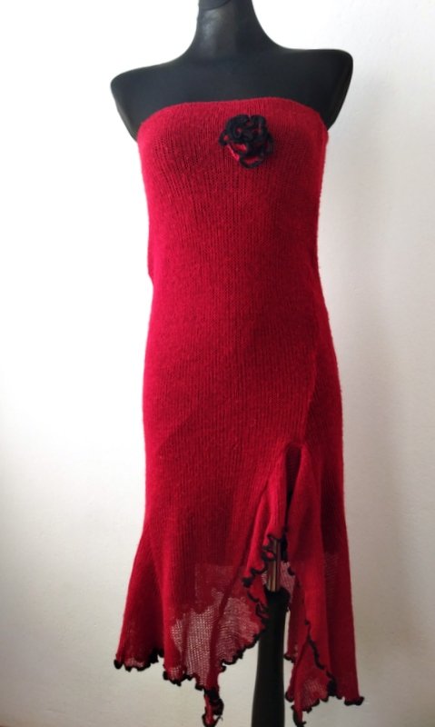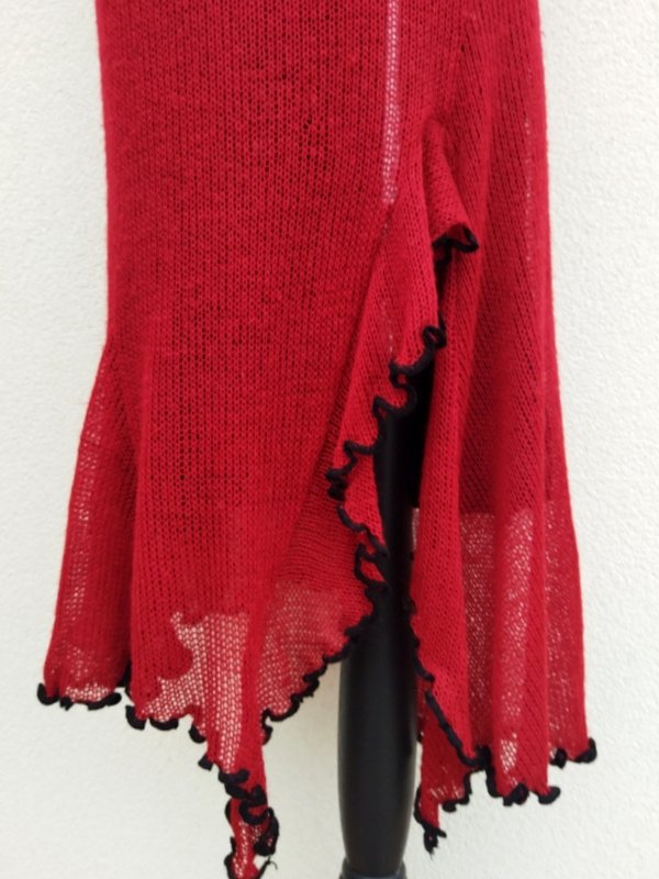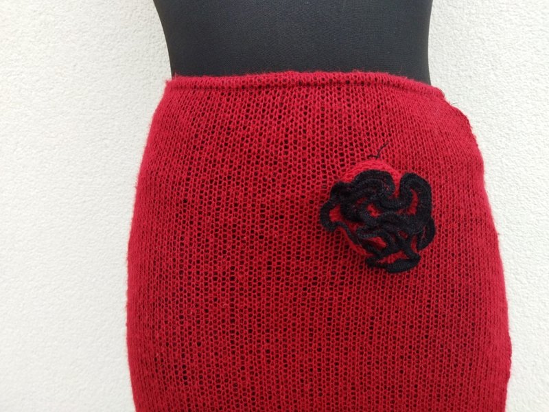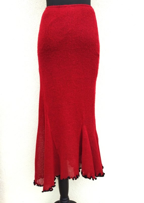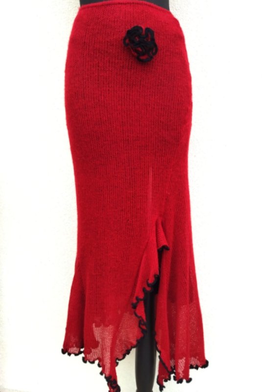 Dzianinowa maxi spódnica z akrylowej włóczki z moherem w kolorze jarzębinowej czerwieni. Wciągana , na gumie w pasie, zdobiona różą, z asymetrycznym rozkloszowanym wstawianymi godetami dołem, z rozcięciem z jednego boku obszytym falbanką z tej samej dzianiny . Endlowana czarną włóczka, zdobiona u góry naszywana różą. Całość na rozciągliwej podszewce. Sprawdzi się również w roli sukienki wciąganej na biust.