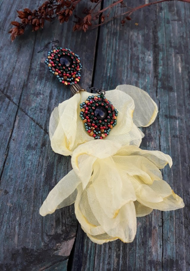 ,,żonkilowa baletnica,, to niezwykle kobiece i lekkie ażurowe kolczyki wykonane z czarnego marmuru oplecionego szklanymi koralikami i kryształkami w różnych odcieniach złota, czerwieni i zieleni. Całości dopełnia długi chwost kwiatek w kolorze żółtym. Kolczyki zawieszone są na klasycznych biglach w kolorze czarnym.