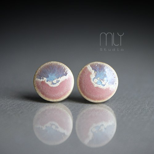 Ceramiczne okrągłe kolczyki w formie sztyftów, ręcznie wykonane z delikatnej gliny kamionkowej, jednostronnie szkliwione mieszanką różowych szkliw z efektem plamek, na antyalergicznych sztyftach w kolorze srebrnym. Średnica ok. 11mm.