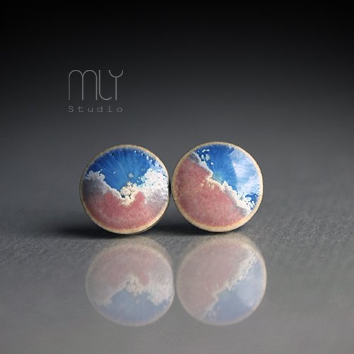 Ceramiczne okrągłe kolczyki w formie sztyftów, ręcznie wykonane z delikatnej gliny kamionkowej, jednostronnie szkliwione mieszanką różowych i błękitnych szkliw z efektem plamek, na antyalergicznych sztyftach w kolorze srebrnym. Średnica ok. 11mm.