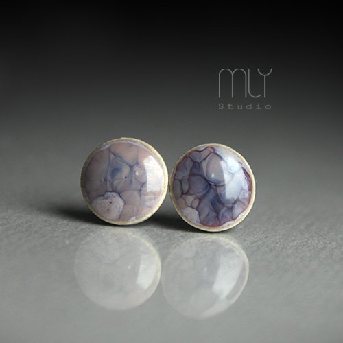 Ceramiczne okrągłe kolczyki w formie sztyftów, ręcznie wykonane z delikatnej gliny kamionkowej, jednostronnie szkliwione mieszanką różowych szkliw z efektem plamek, na antyalergicznych sztyftach w kolorze srebrnym. Średnica ok. 9mm.
