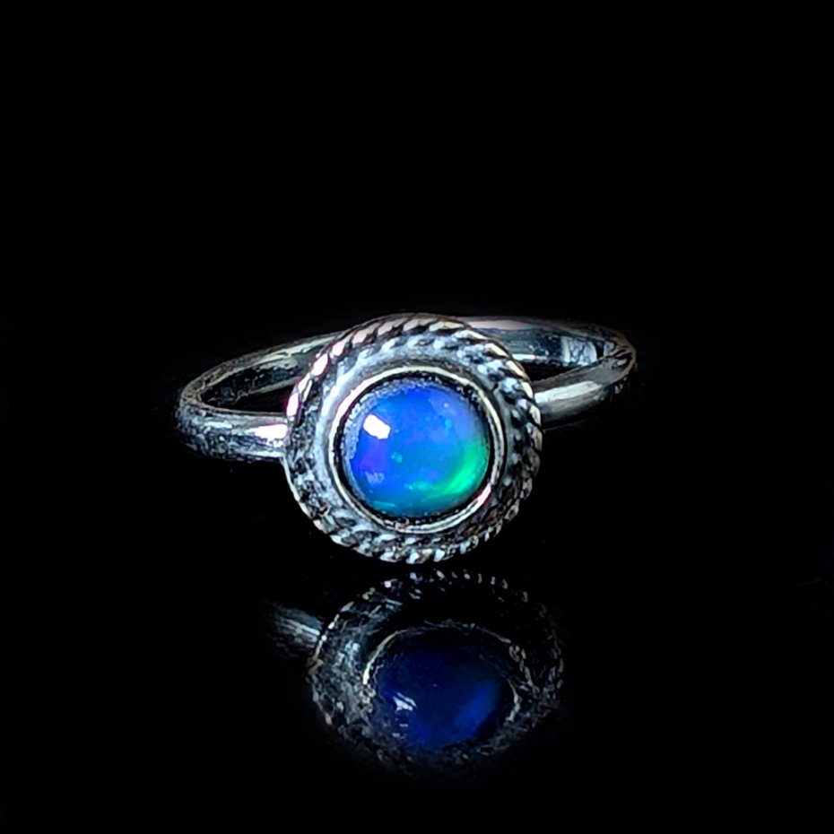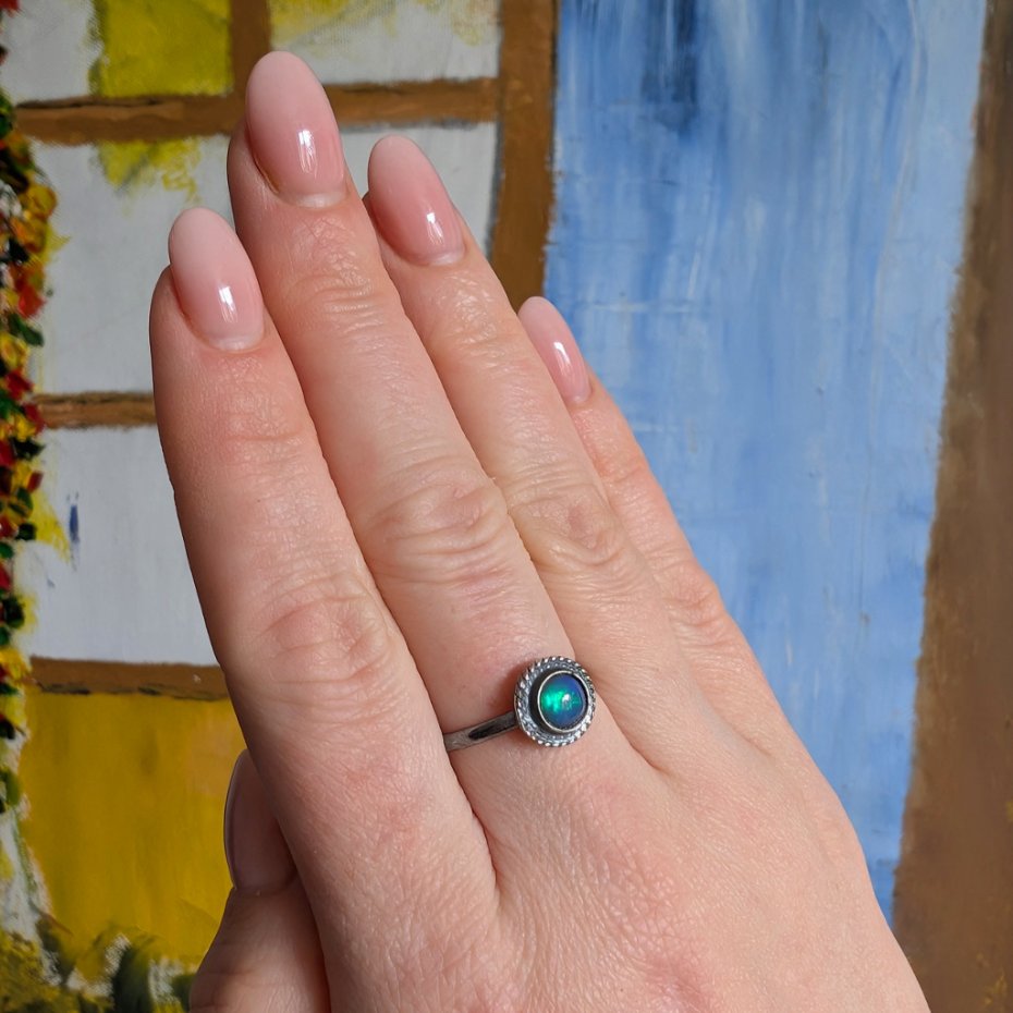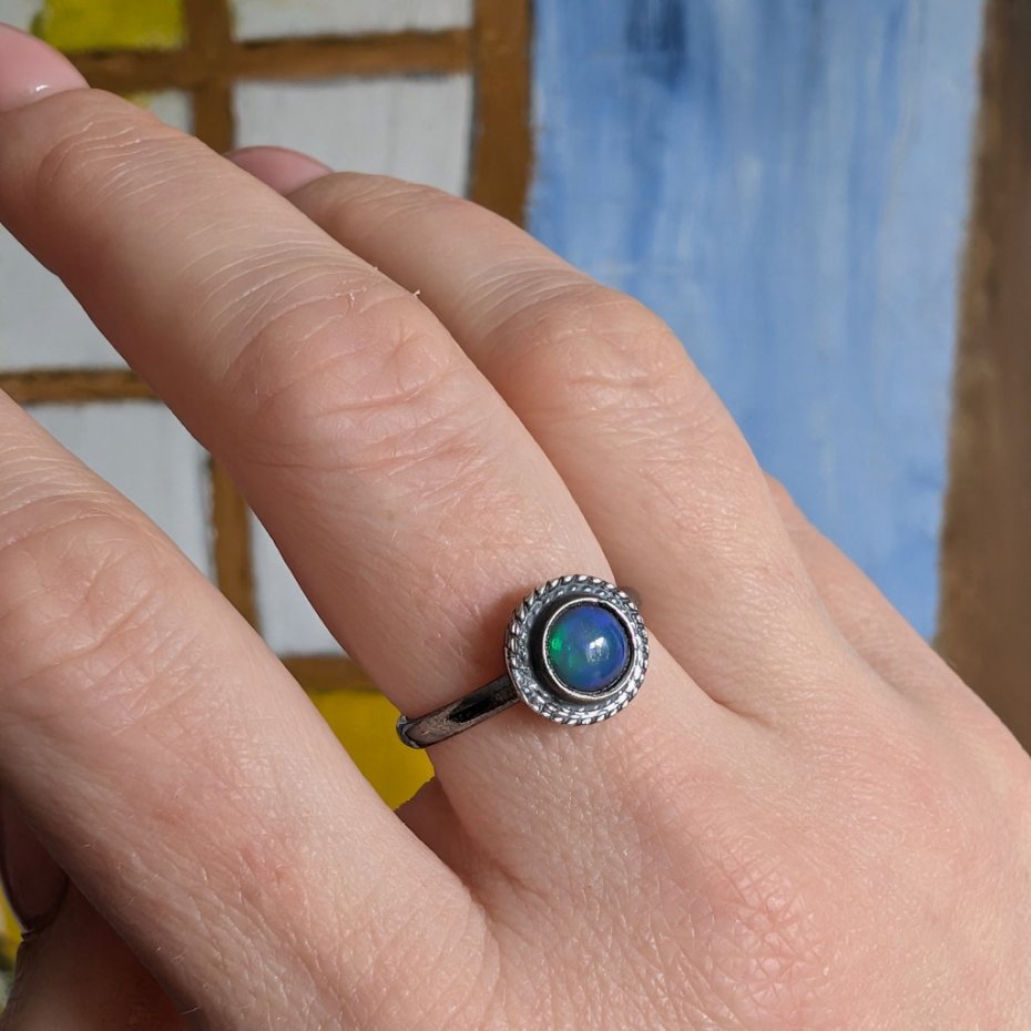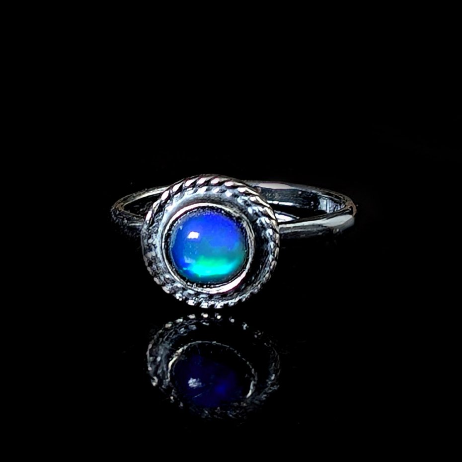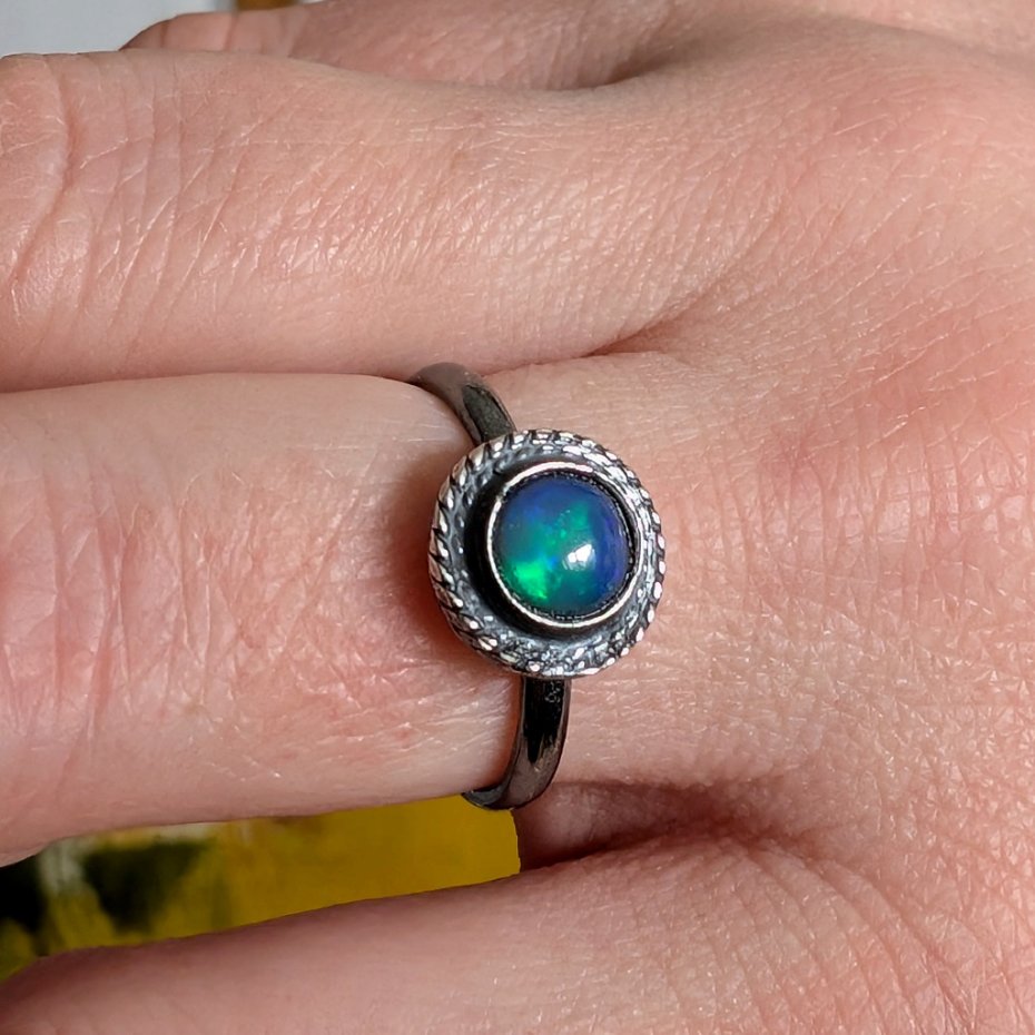 Pierścień z oprawionym opalem etiopskim o niebieskiej tafli z zieloną poświatą. Srebro pr.925, oksydowane. Srednica oprawy 9 mm. Waga 2,7 g. Rozmiar jubilerski 16. Obrączka ma 2 mm szerokości. Zapakowany w ozdobne pudełeczko.