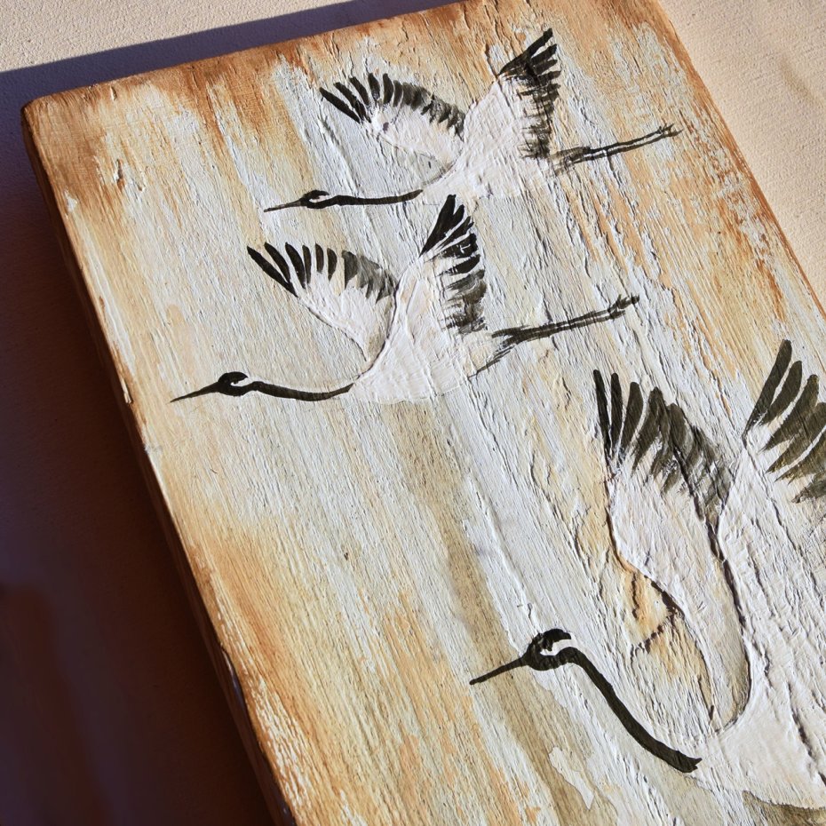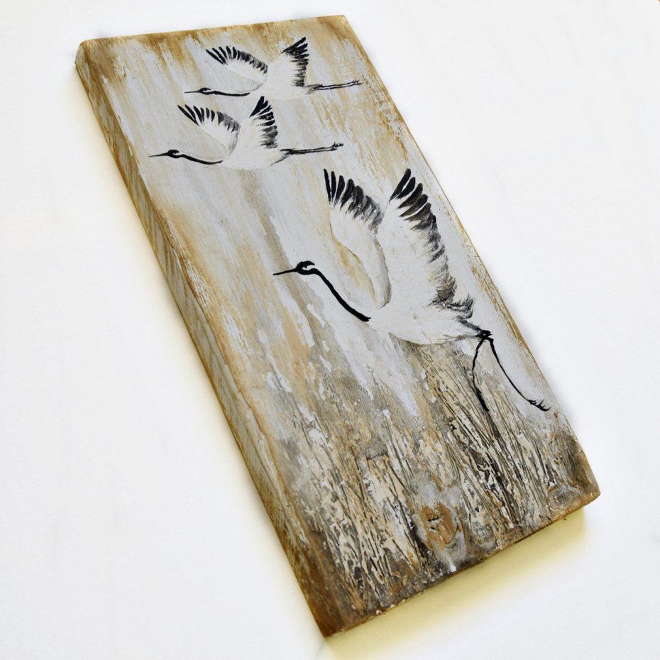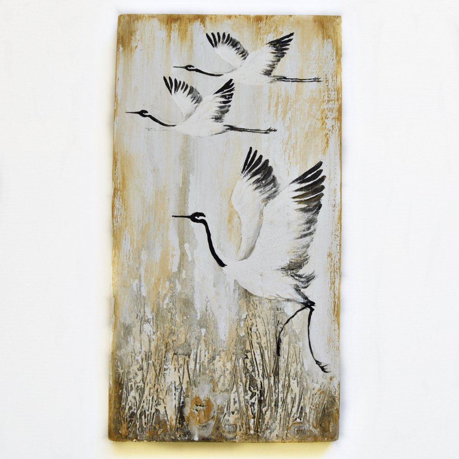Tagi: #obraz malowany na desce, #obraz na desce żurawie, #obrazy do salonu ptaki, #obrazy żurawie ptaki