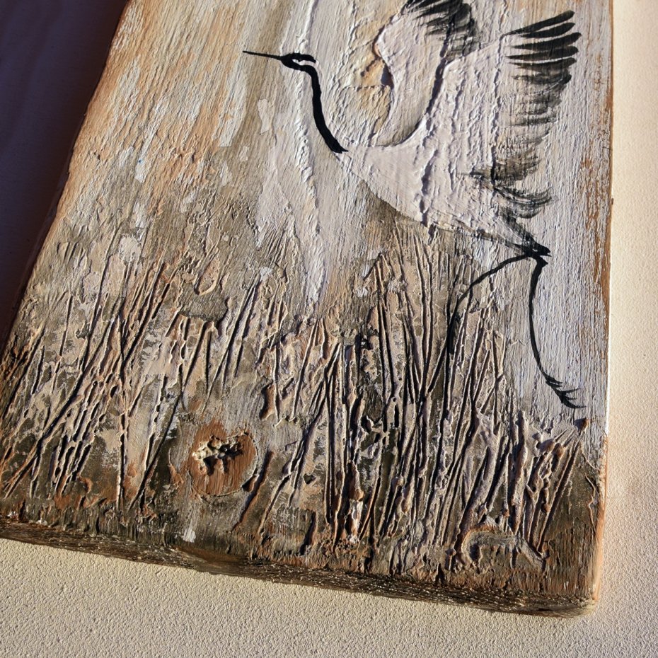 Obraz z serii Żurawie, malowany farbami akrylowymi, częściowo z grubą, wyraźną strukturą, na grubej desce sosnowej. Całość jest pokryta werniksem dla ochrony przed wilgocią.