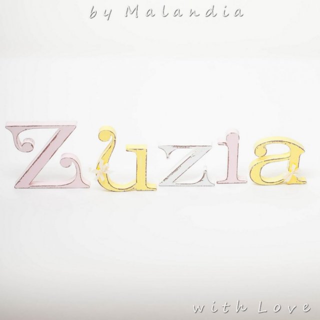 Imię Zuzia w pastelowych kolorach, z tyłu taśma dwustronna do mocowania napisu na ścianie.