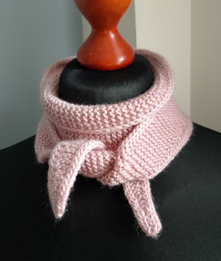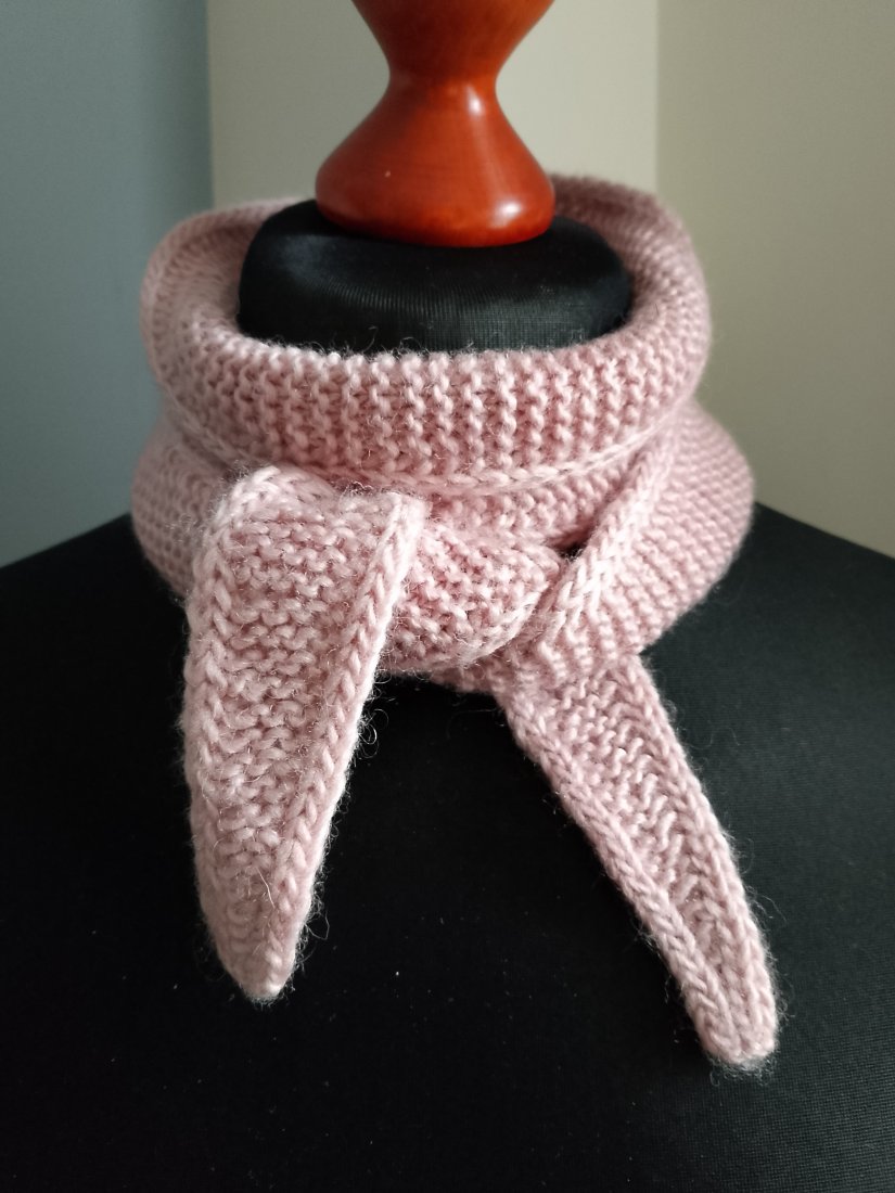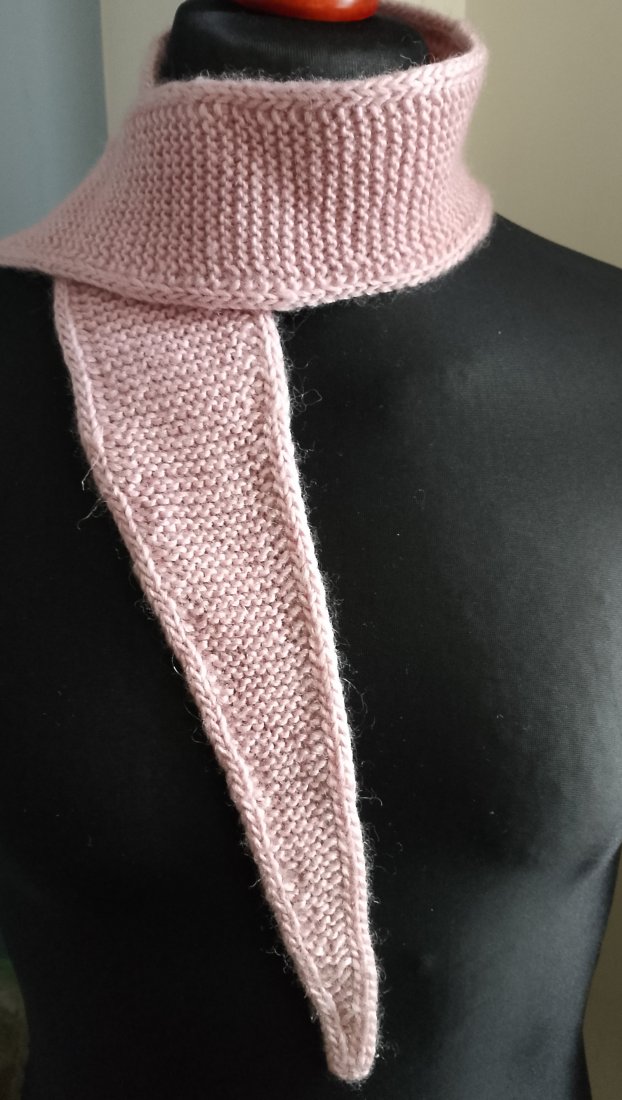 Mini szalik wykonany w całości ręcznie na drutach. Użyto bardzo dobrej jakościowo, delikatnej w dotyku włóczki akrylowo moherowej.