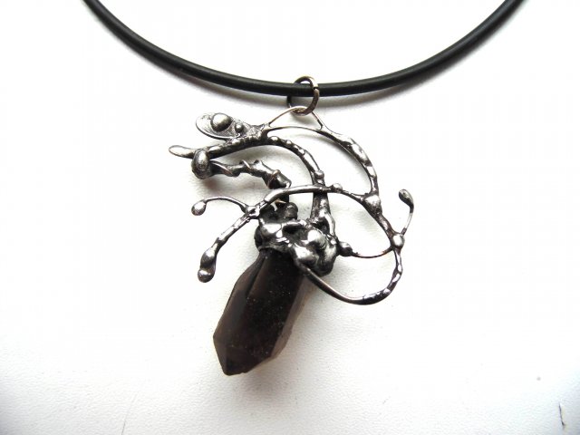 Wisiorek wykonany z miedzi, cyny i dymnego kwarcu. Wymiary ok. 5,5 na 4 cm. Zawieszony na czarnej lince kauczukowej o długości ok. 45 cm.