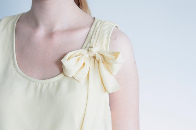 Zwiewna, cytrynowa bluzka marki VILA. Kolor to bardzo, bardzo jasny żółty. Materiał na boku dekoltu można dowolnie układać, wiązać lub pozostawić luźno. Posiada podszewkę.