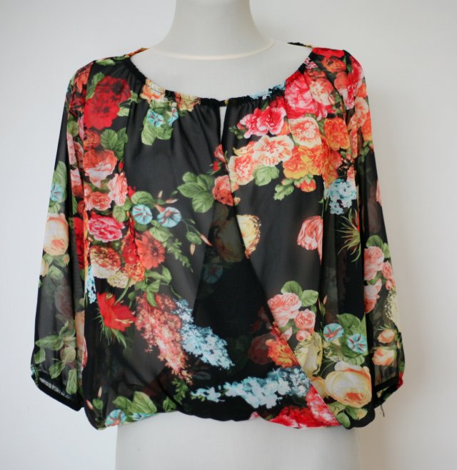 Piękna, zwiewna bluzka w kwiaty, z zakładką z przodu, lekko prześwitująca, na dole, przy rękawach i szyi wszyte gumki. Stan idealny.