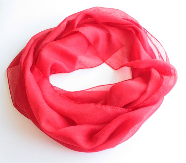 Czerwony, cienki szal. Materiał oceniam na wiskozę lub poliester.