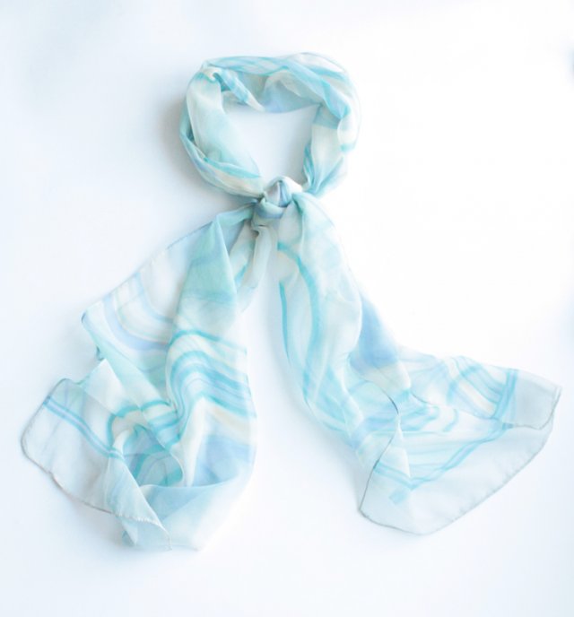 Zwiewny szal typu mgiełka w bajecznych odcieniach błękitu. Materiał to prawdopodobnie poliester.