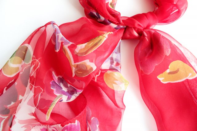 Zwiewny szal typu mgiełka w nasyconych kolorach. Materiał to prawdopodobnie poliester.