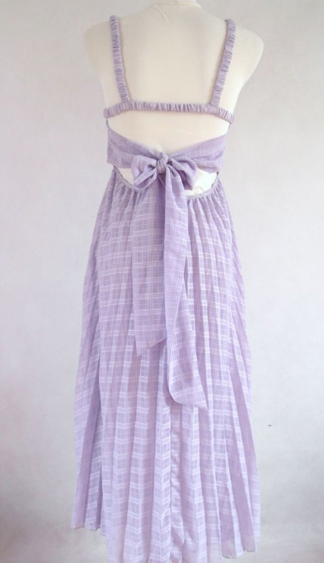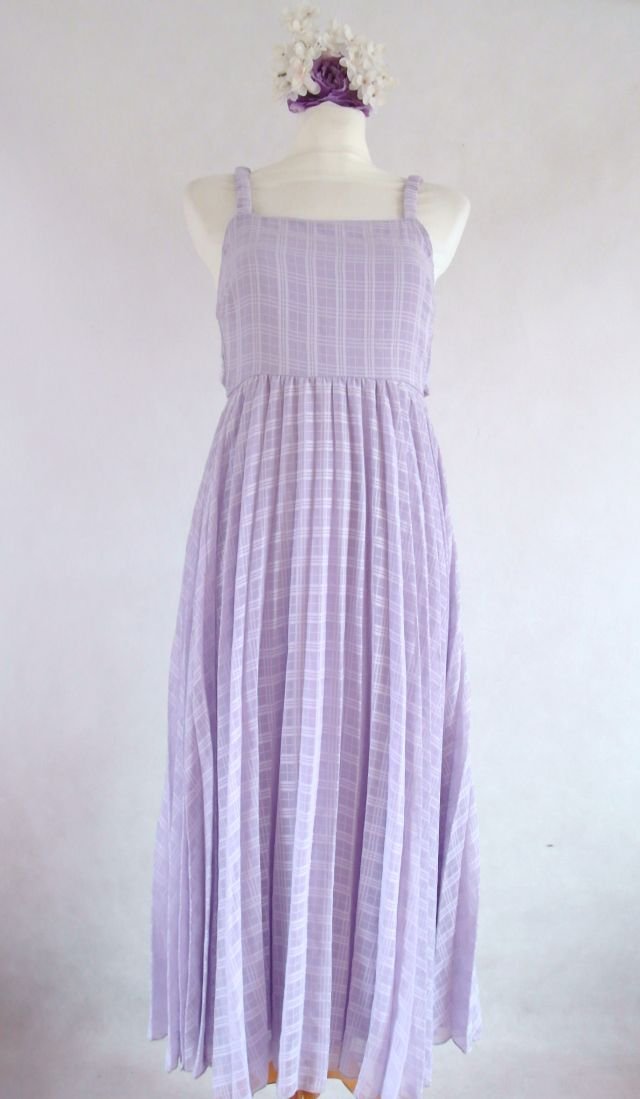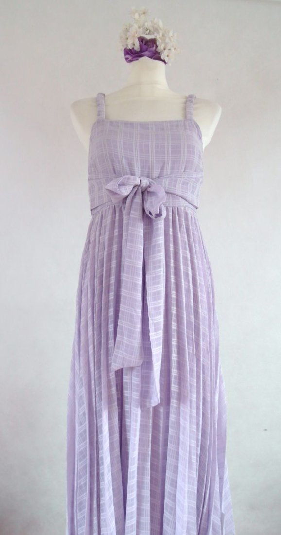 kolor - jaśniutki bez, a może fiołek..Cienki, delikatny, przeźroczysty materiał w delikatną kratką na cienkiej podszewce. Wszystkie ramiączka topu mają gumkę, daje to możliwość pewnego dopasowania.Tył plisowanego dołu ma suwak.Na bokach jest wszyta szarfa - można ją albo z przodu wiązać, albo z tyłu.Delikatna, zwiewna, na różne uroczystości, polecam