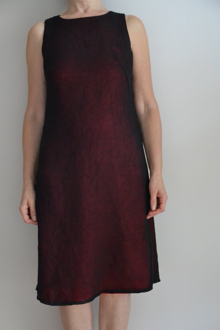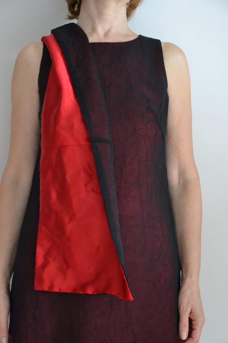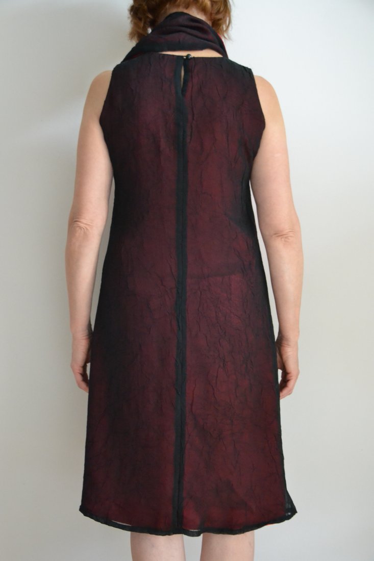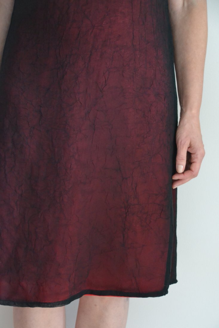 Uszyta z warstwy w kolorze mocnej, nieco bordowej czerwieni, na którą nakłada się warstwa gniecionej przezroczystości.