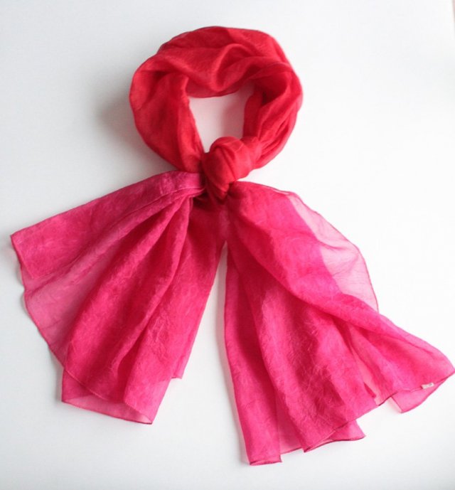 Szeroki, zwiewny szal o lekko gniecionej fakturze, w mocnych odcieniach czerwieni i fuksji.
