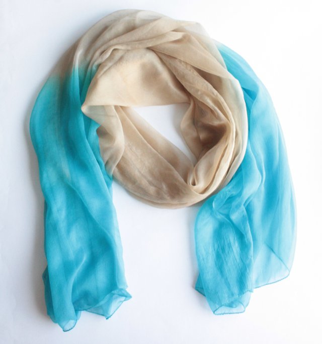 Zwiewny, duży szal w pięknych przelewanych odcieniach beżu i błękitu. Materiał to prawdopodobnie jedwab naturalny lub syntetyczny.
