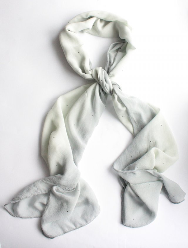 Zwiewny szal w przelewanych odcieniach jasnej szarości, oprószony metalowymi drobinkami (nie błyszczą). Materiał to prawdopodobnie jedwab.