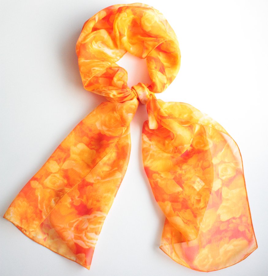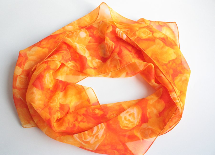 Zwiewny szal w róże w mocnym odcieniu pomarańczu.