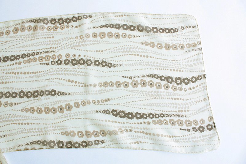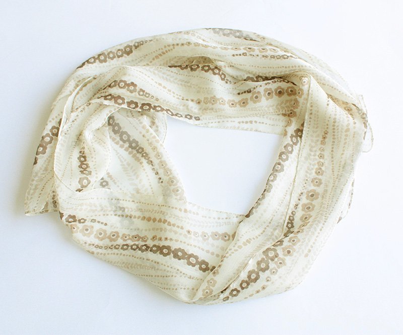 Subtelny, zwiewny szal wykonany prawdopodobnie z tkaniny syntetycznej.