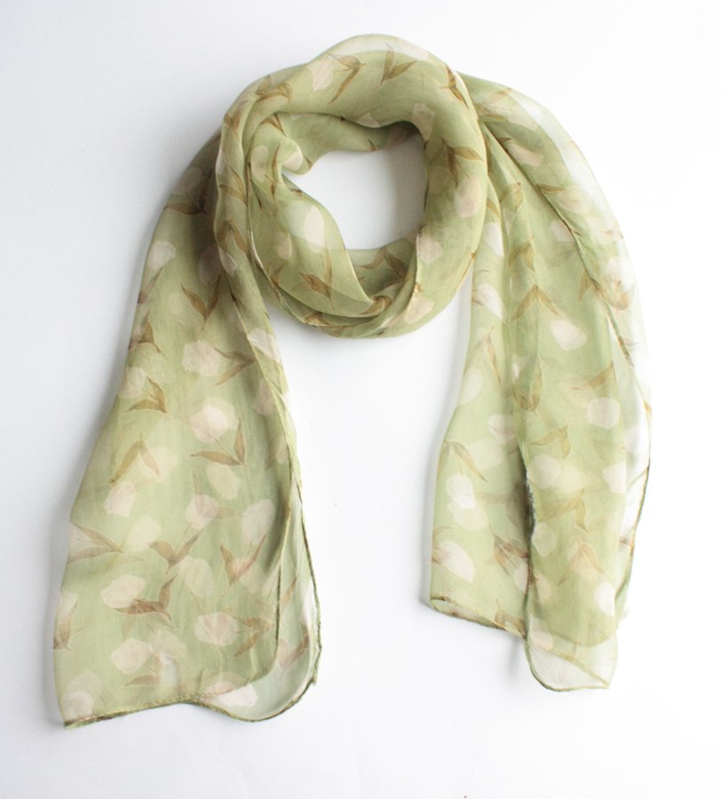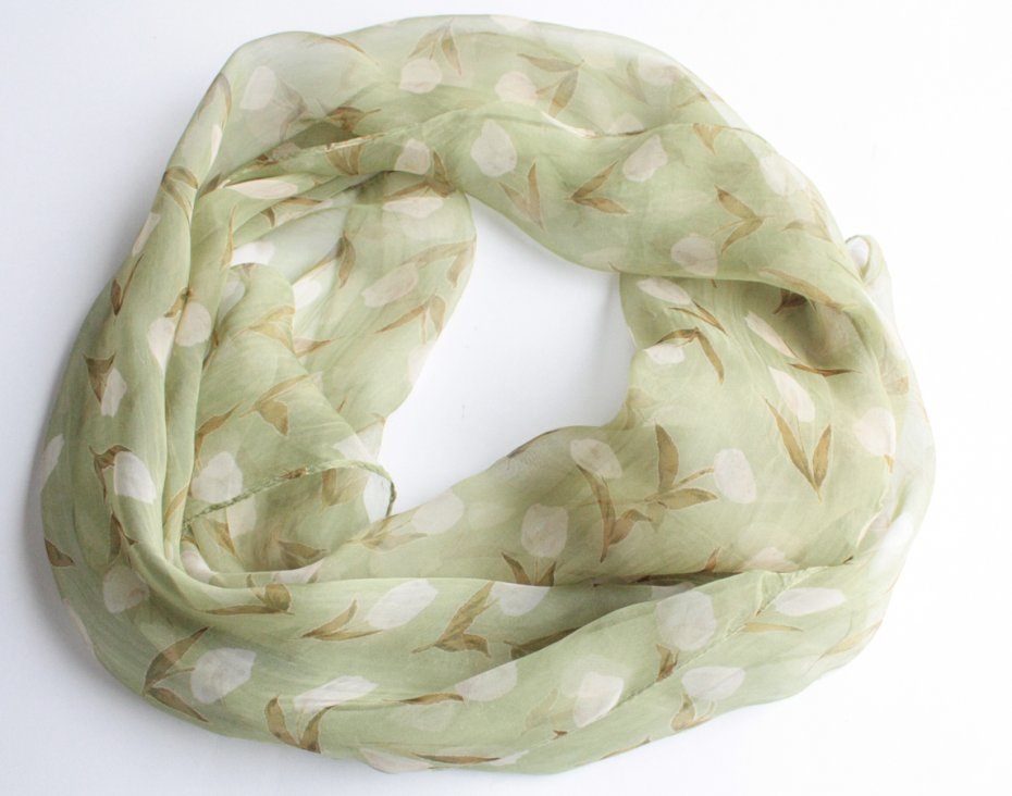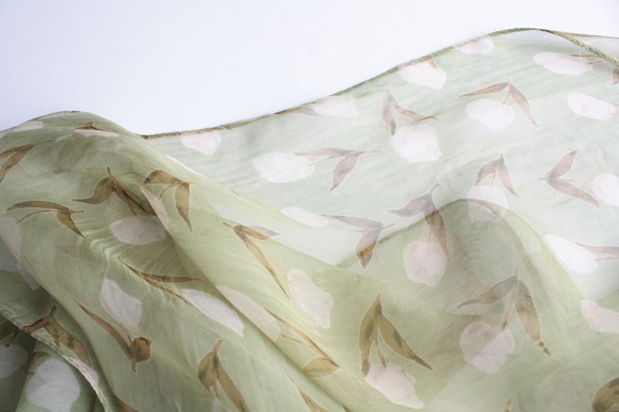 Zwiewny, półtransparentny szal w kwiatowe wzory. Materiał oceniam na wiskozę lub poliester.