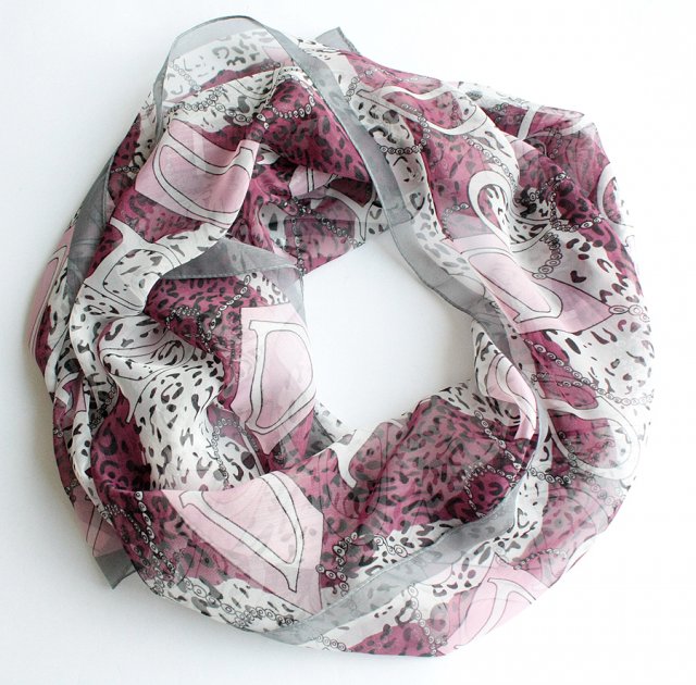 Zwiewny szal w zwierzęce motywy. Materiał to prawdopodobnie wiskoza lub poliester.