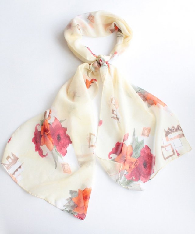 Subtelny, kobiecy szal w kwiatowe motywy.