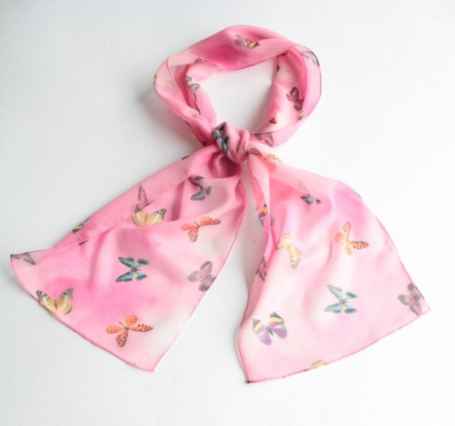 Zwiewny, półtransparentny szal w motyle. Materiał to prawdopodobnie wiskoza lub poliester.