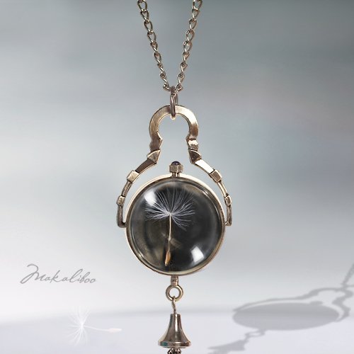 Każdy egzemplarz jest niepowtarzalny. Nasionka zostały specjalnie spreparowane i nie zmienią swojego wyglądu podczas noszenia. Naszyjnik jest kulą i ma średnicę 2,5 cm. Długość łańcuszka 80 cm. Baza w kolorze antycznego złota. Dmuchawiec jest symbolem inteligencji, otwartego umysłu, siły przetrwania, czystości, szczęścia. Ofiarowany przez kogoś - uznawany jest za symbol absolutnej wierności i początku czegoś nowego.