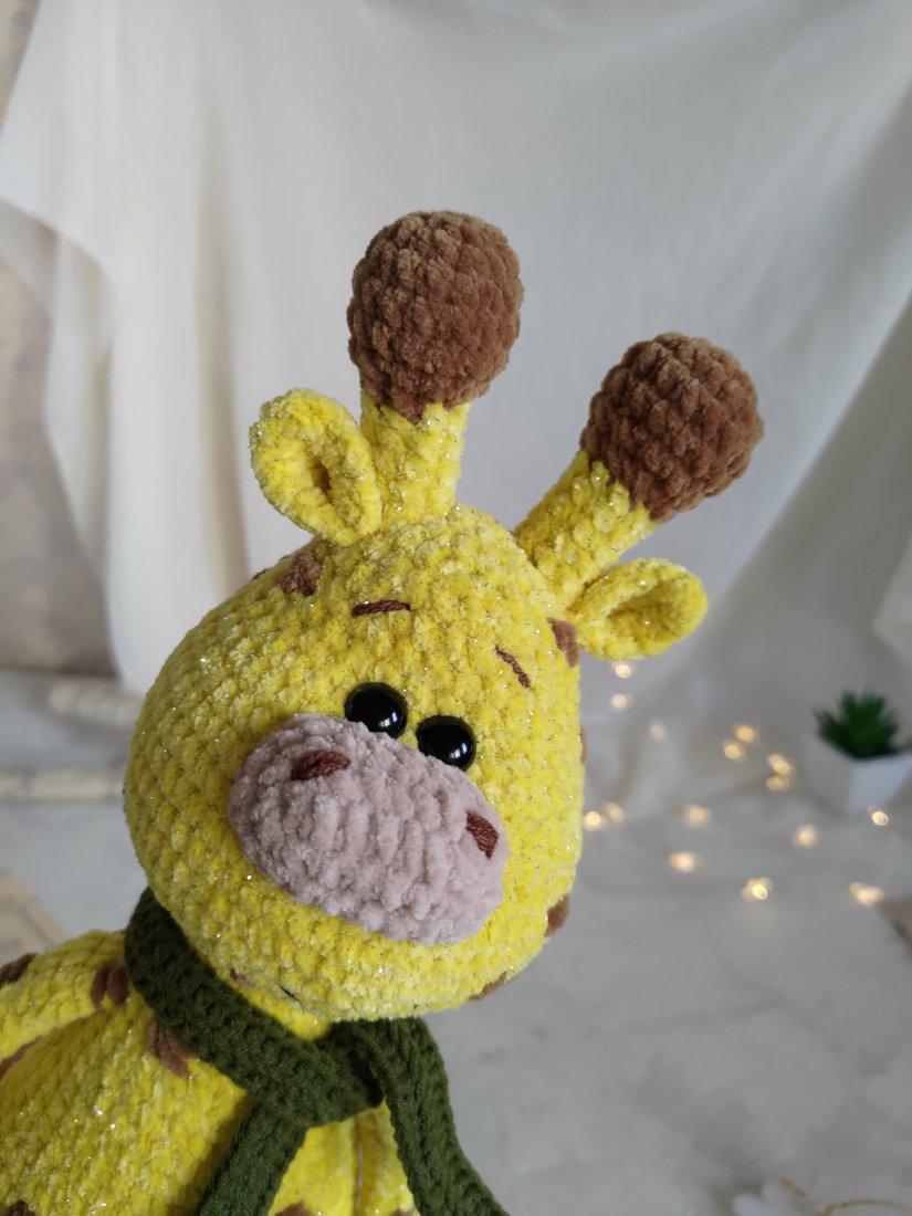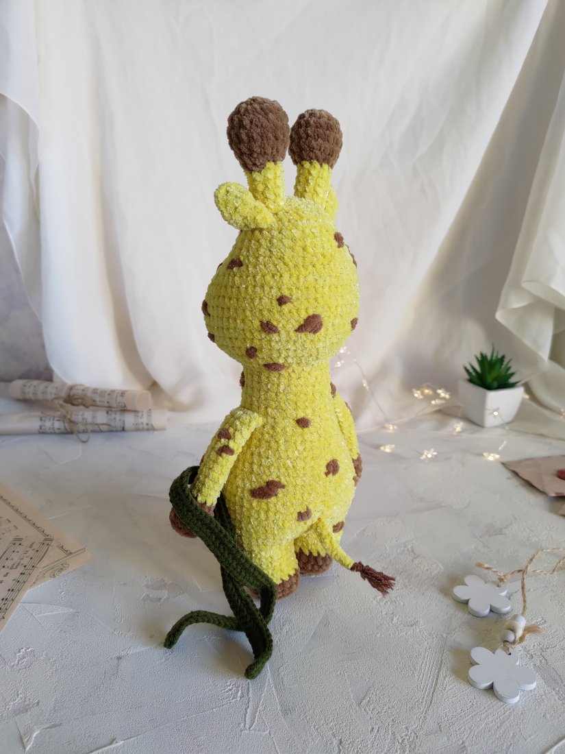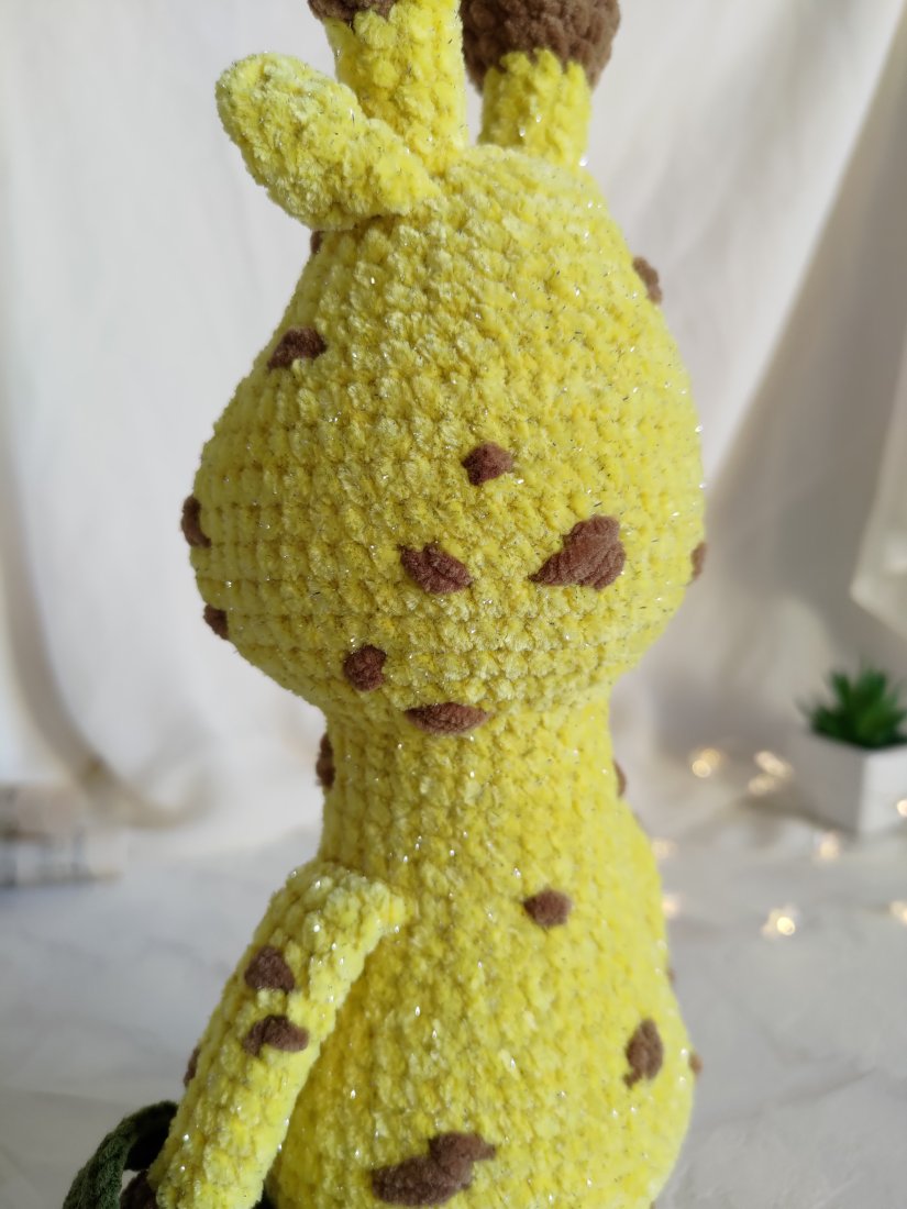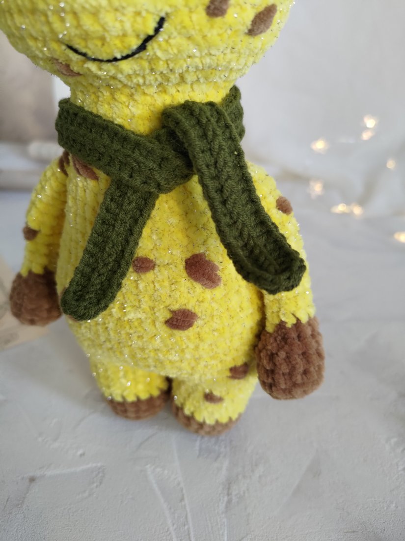 • Żyrafka jest wykonana z włóczki pluszowej (100% poliester) z dodatkiem błyszczącej nici, która posiada Certyfikat Oeko-Tex. Ta włóczka nadaje maskotce naprawdę świąteczny i unikalny wygląd!