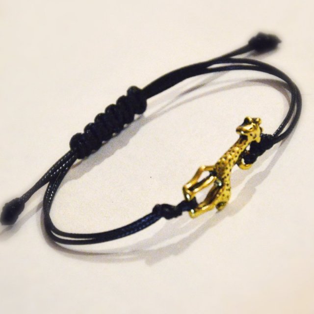 Delikatna bransoletka wykonana ze sznureczka w kolorze czarnym i żyrafy w kolorze złotym. Z możliwością regulacji szerokości.