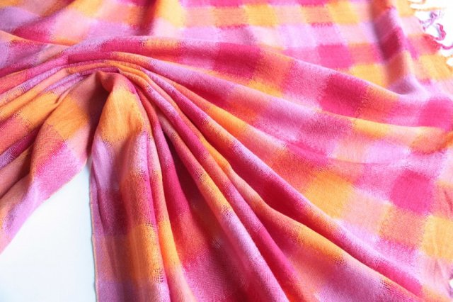 Miękki, miły w dotyku szal w żywych, pięknych kolorach. Ciekawa tkanina o różnorodnym, miejscami transparentnym splocie.