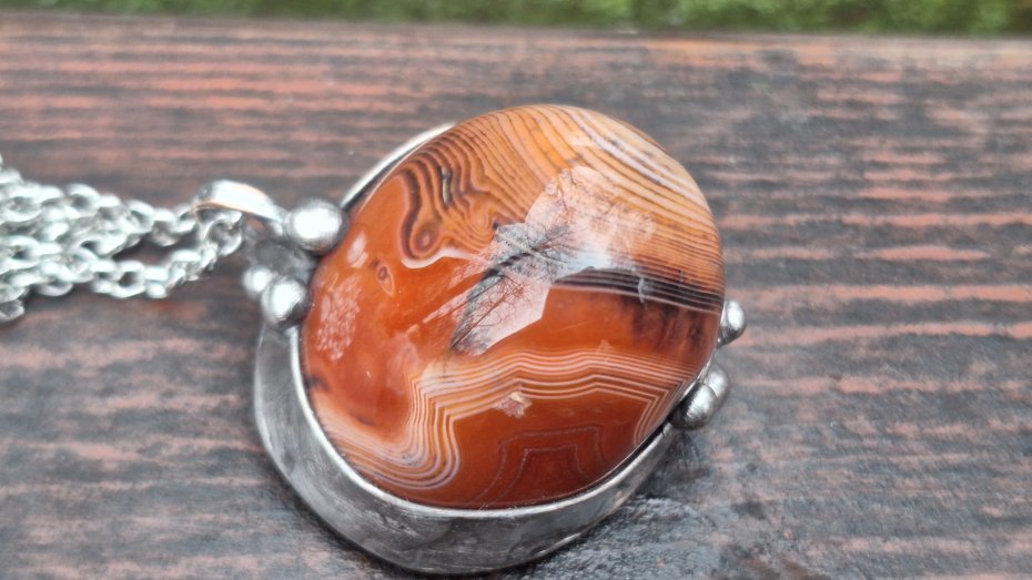 Wisiorek wykonany z miedzi, cyny i agatu. Wymiary ok. 3.5 na 3.5 cm. Zawieszony na łańcuszku o długości ok. 50 cm.