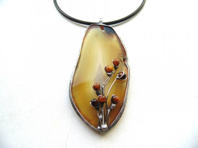 Wisiorek wykonany techniką witrażową z miedzi, cyny, agatu i kulek tygrysiego oka. Zawieszony na czarnej lince kauczukowej o długości ok. 45 cm. Wymiary ok. 8 na 3,5 cm.